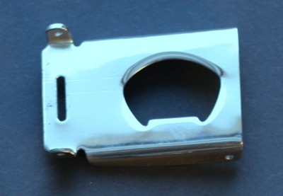 Otvírák na zátky na skleněných lahvích. Otvírák se nachází na přezce na opasky zezadu. Je vyřezávaný z nerezového plechu. Otvírák je plně funkční. Na přezku zepředu se eventuelně může dle požadavků zákazníka vygravírovat log či jiný motivu na povrch otvíráku, načež může být i vybarven. V tomto případě otvírák je vyleštěný a následně povrchově upraven niklem. Povrchově upravený může být i jinak dle přání zákazníka.
